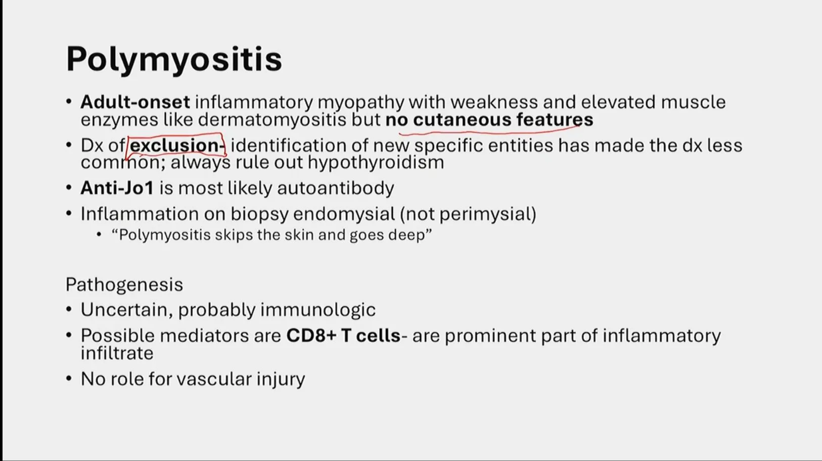 {{c1::Polymyositis}} involves only muscle weakness ("goes deep"), only has the {{c2::Anti-Jo-1}} antibody, and involves inflammation of the {{c2::endo}}mysium.