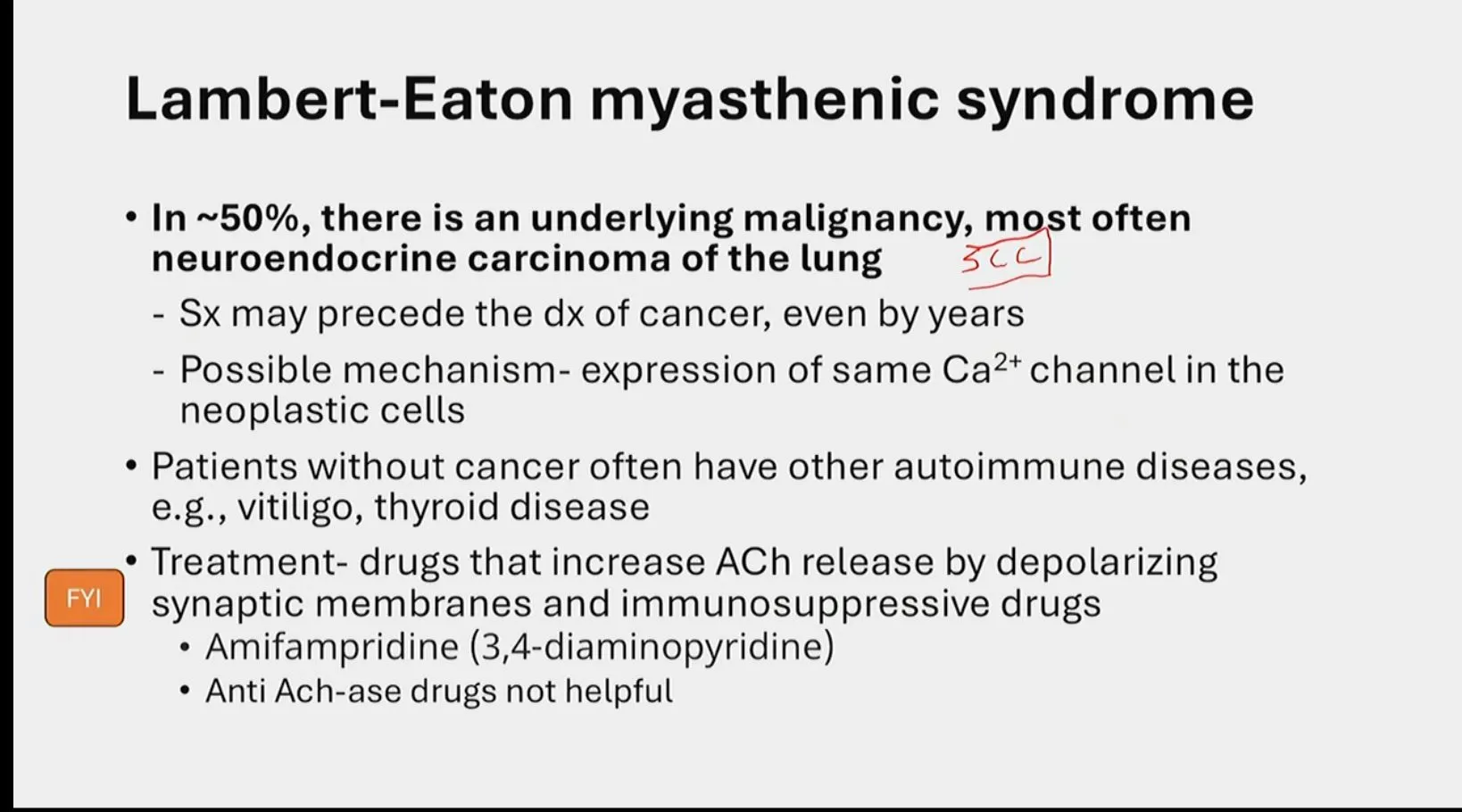 {{c1::Lambert Eaton Myasthenic Syndrome}} is associated with {{c2::small cell lung}} carcinoma and improves upon repeated muscle stimulation.