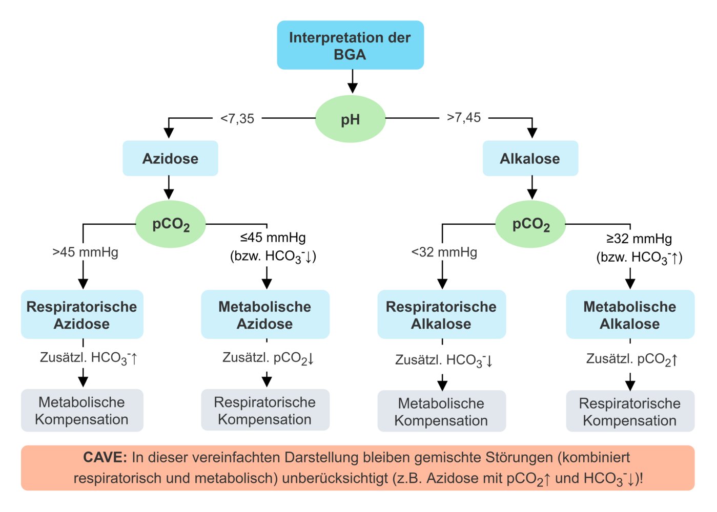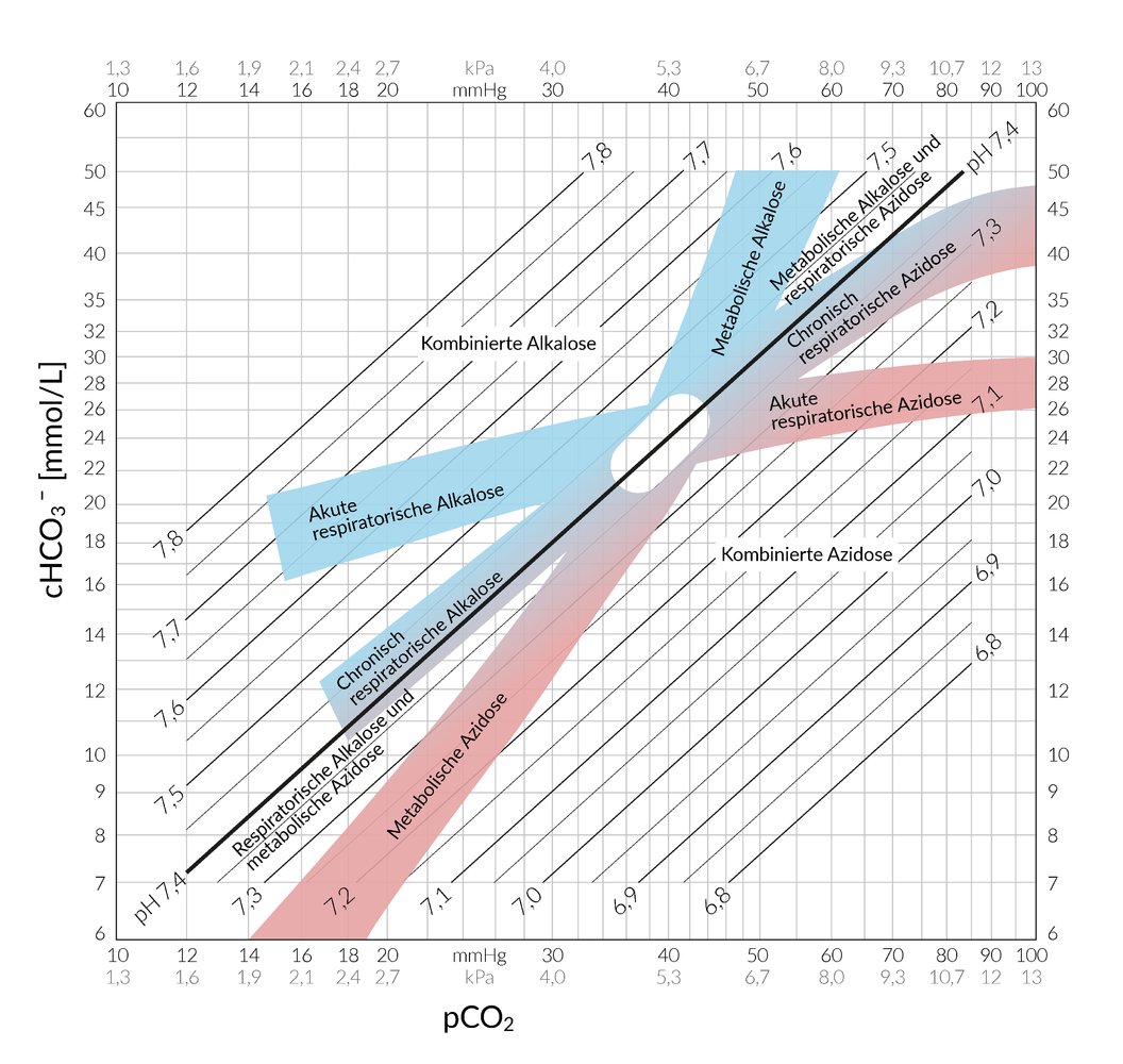 <i>Interpretation einer Blutgasanalyse </i>(<u>BGA</u>)<br><img alt="Interpretation einer Blutgasanalyse (BGA)" src="c4404d00e7f0a82c2102777acbc47b72.jpg" width="740"><br>Quelle: © AMBOSS SE, Berlin und Köln, Germany<br><br><i>Nomogramm nach O. Müller-Plathe</i><br><div>Hilfsmittel zur Beurteilung der Ergebnisse einer BGA in Bezug auf Störungen des Säure-Base-Haushalts:</div><div><i>X-Achse</i>: pCO<sub>2</sub>-Wert</div><div><i>Y-Achse</i>: Bicarbonatkonzentration (cHCO<sub>3</sub><sup>−</sup>)</div><div>Beides logarithmisch aufgetragen → Ermöglicht pH-Werte als parallele Linien einzuzeichnen</div><div><i>Ovaler Bereich in der Mitte</i>: pCO<sub>2 </sub>= 40 mmHg und cHCO<sub>3</sub><sup>− </sup>= 24 mmol/L → Normwerte (Referenzbereich)<br></div><img alt="Nomogramm nach O. Müller-Plathe" src="0c5fd715385c88048be29a920366f242.jpg" width="740"><br>Quelle: © AMBOSS SE, Berlin und Köln, Germany