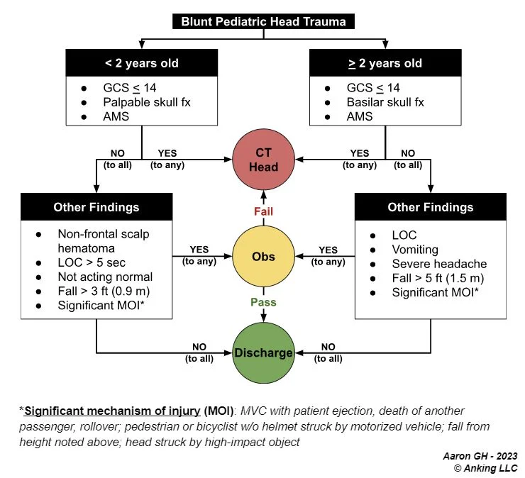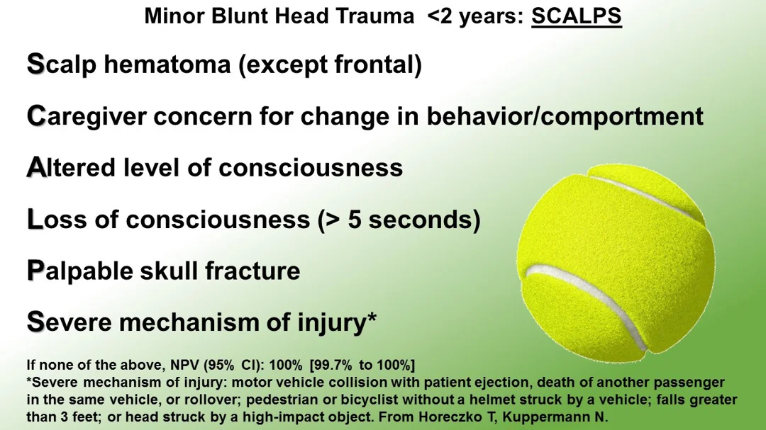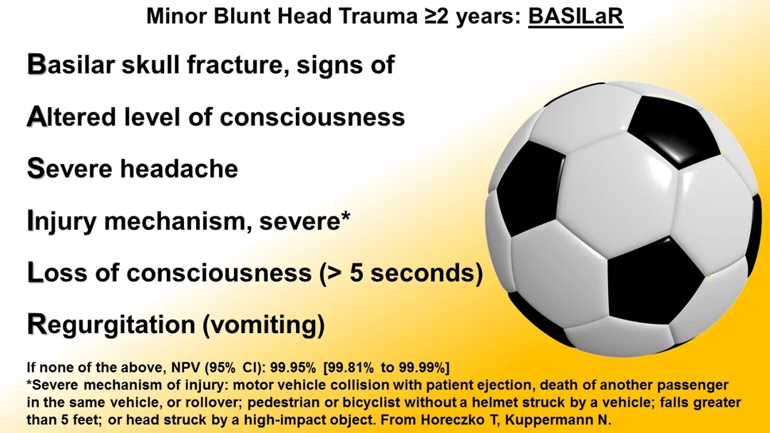 <a href="https://www.mdcalc.com/calc/589/pecarn-pediatric-head-injury-trauma-algorithm">PECARN</a> rule for children ≤ 24 hours after a nonpenetrating clinically relevant head trauma<br><br><u>B</u>asilar skull fracture<br><u>A</u>ltered level of consciousness<br><u>S</u>evere headache<br><u>I</u>njury mechanism severe<br><u>L</u>oss of consciousness (<u>a</u>ny duration)<br><u>R</u>egurgitation (vomiting)<br><br><img src="375495137adf0ee66a1f20f895024afe.jpg"><br><br><img alt="emDOCs.net – Emergency Medicine EducationPEM Playbook - Blunt Head Trauma - emDOCs.net - Emergency Medicine Education" src="e4bef76ee7b6f20e454ea56c1c9a07e7.jpg" width="608"><br><span style="font-size: 10pt;">Photo Credit: <a href="http://www.emdocs.net/pem-playbook-blunt-head-trauma/">emDOCs</a></span><br><br><img alt="Mnemonics for bedside risk stratification of minor ... | GrepMed" src="ed068fed2bfe33a9523e2680e52f52bf.jpeg" width="632"><br><span style="font-size: 10pt;">Photo credit: <a href="http://www.emdocs.net/pem-playbook-blunt-head-trauma/">emDOCs</a></span>