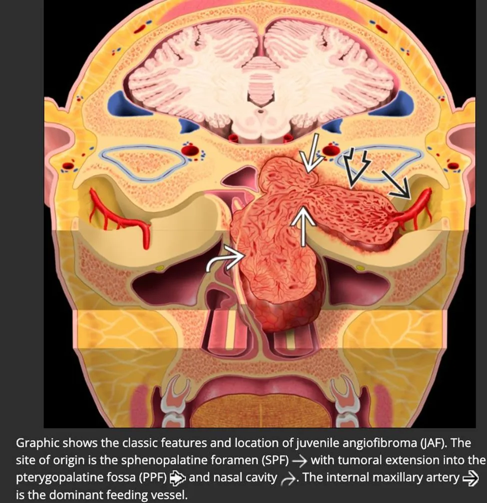 <b>Juvenile nasopharyngeal angiofibroma commonly </b>spreads from the sphenopalatine foramen into the {{c1::<u>nasopharynx</u>}} and {{c2::<u>pterygopalatine fossa</u>}} with associated bony remodeling