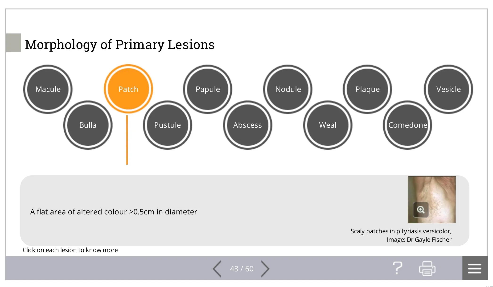 A {{c1::patch}} refers to {{c2::a flat area of altered colour}} of {{c2::>0.5 cm::size}} in diameter