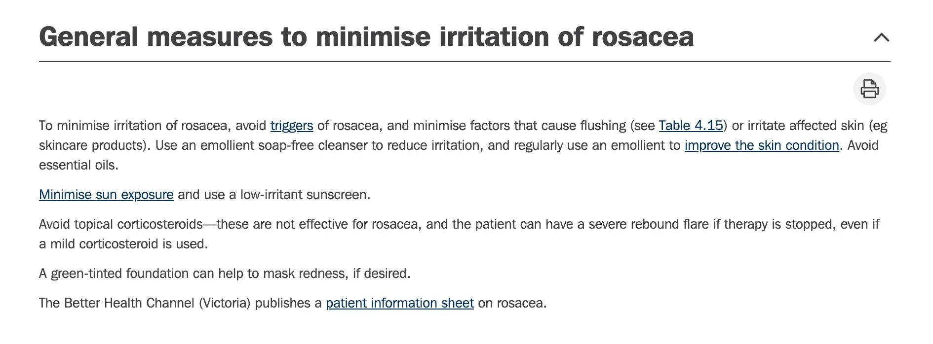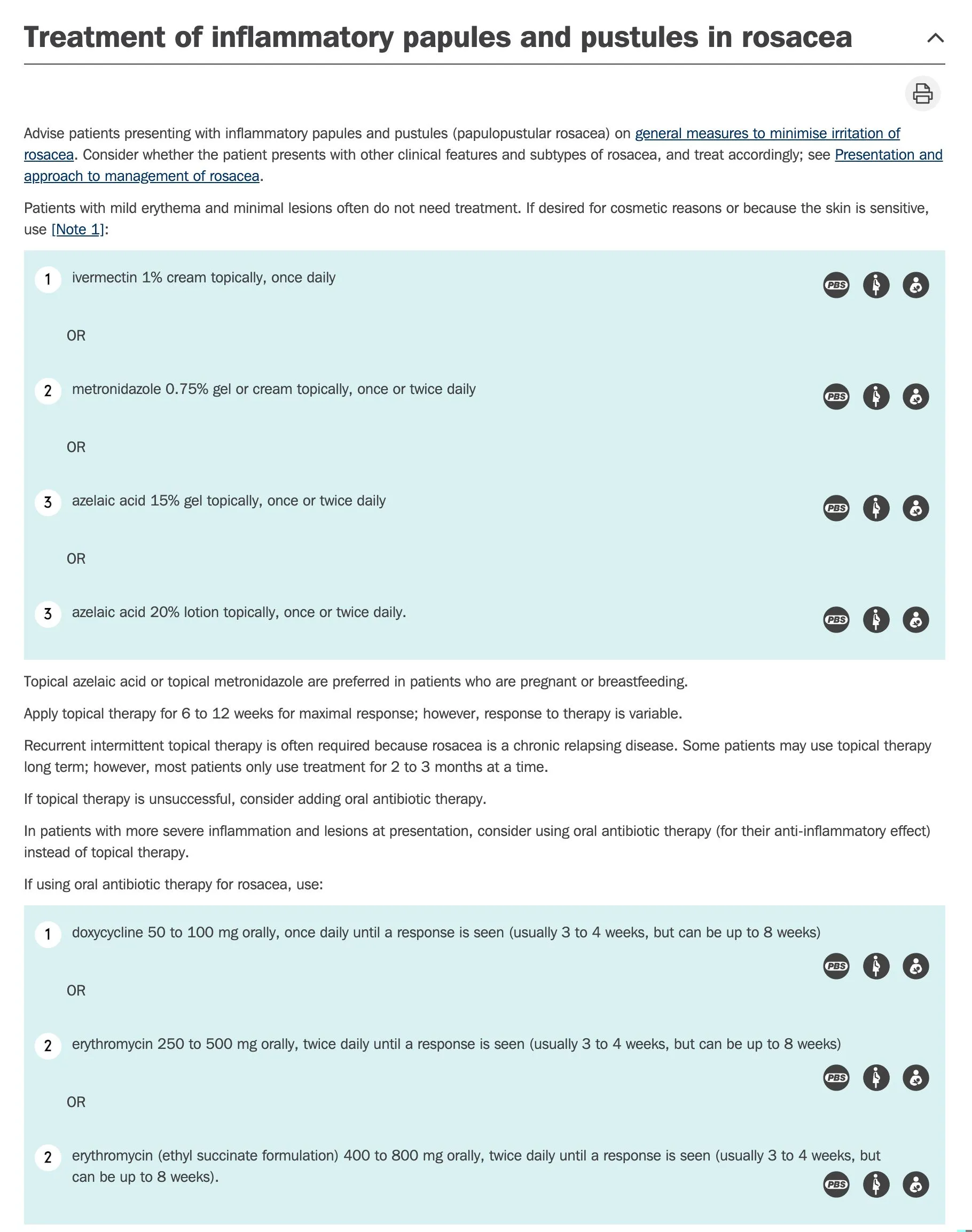 eTG - Rosacea <a href="https://tgldcdp.tg.org.au/viewTopic?etgAccess=true&guidelinePage=Dermatology&topicfile=c_DMG_Rosacea_topic_1&guidelinename=auto§ionId=c_DMG_Rosacea_topic_1#c_DMG_Rosacea_topic_1">https://tgldcdp.tg.org.au/viewTopic?etgAccess=true&guidelinePage=Dermatology&topicfile=c_DMG_Rosacea_topic_1&guidelinename=auto&sectionId=c_DMG_Rosacea_topic_1#c_DMG_Rosacea_topic_1</a> Published August 2022, Accessed 30 September 2024<br><br>Dermatology Modules - Rosacea - The Australian College of Dermatologists
