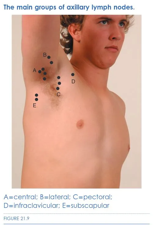 What are the groups of <b>axillary lymph nodes </b>when performing a haematological exam?<br><br>{{c1::Subscapular<br>Lateral<br>Pectoral<br>Infraclavicular<br>Central::5}}