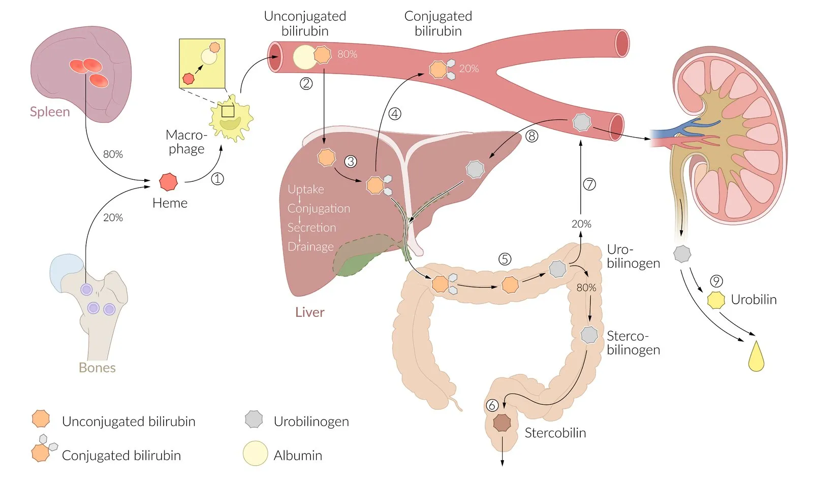 Elevated {{c2::<u>conjugated</u>}}<u> bilirubin</u> <i>suggests</i> {{c1::<b>post</b>}}-<b>hepatic</b> <b>jaundice</b>