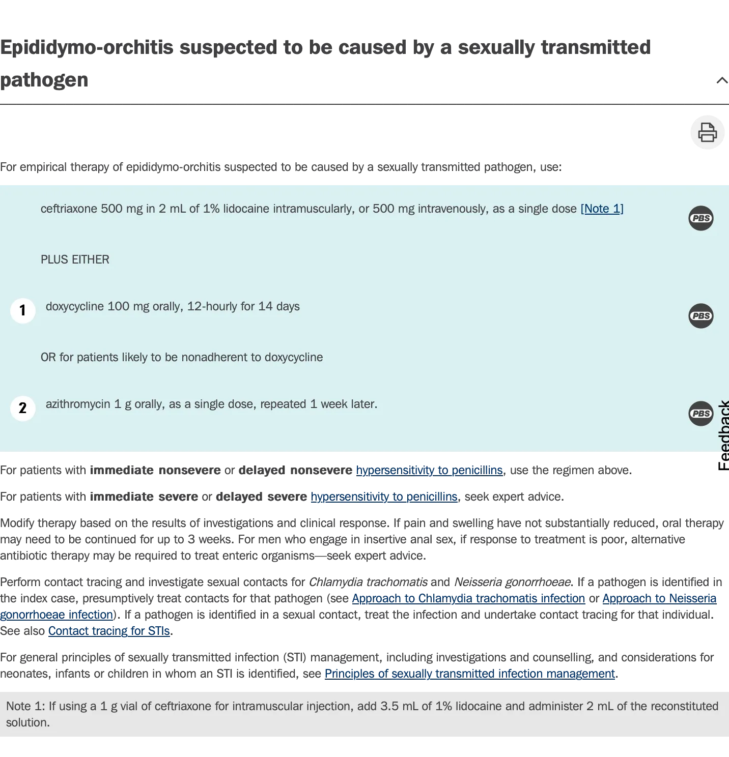 eTG - Epididymo-orchitis <a href="https://tgldcdp.tg.org.au/viewTopic?etgAccess=true&guidelinePage=Antibiotic&topicfile=epididymo-orchitis">https://tgldcdp.tg.org.au/viewTopic?etgAccess=true&guidelinePage=Antibiotic&topicfile=epididymo-orchitis</a> Published April 2019, Accessed 12 November 2024