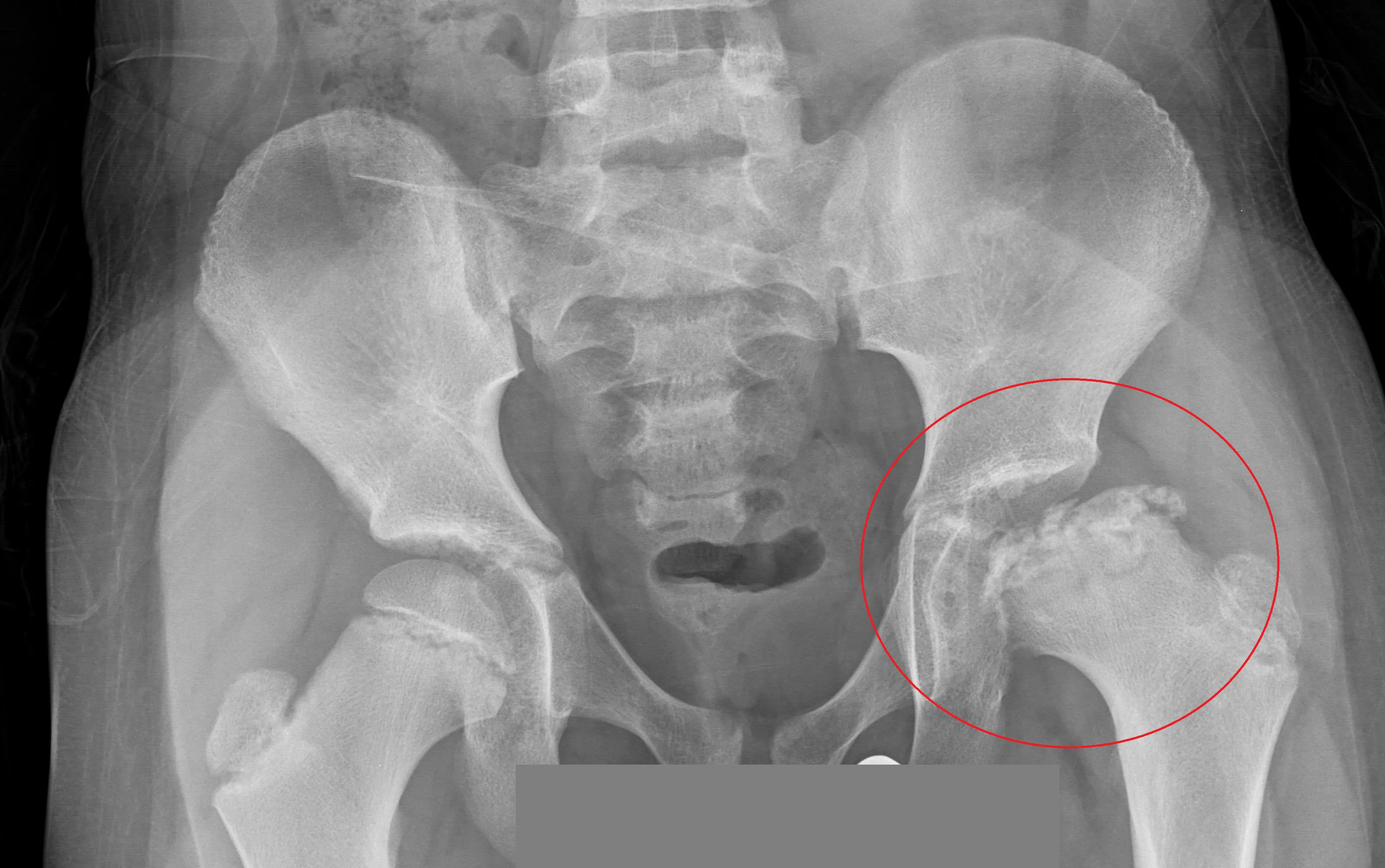 Criança de 6 anos com claudicação e essa radiografia.