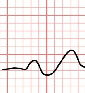 Sine wave with absent P waves and a wide QRS complex that merges with the T wave; a marker of impending V-Fib and asystole