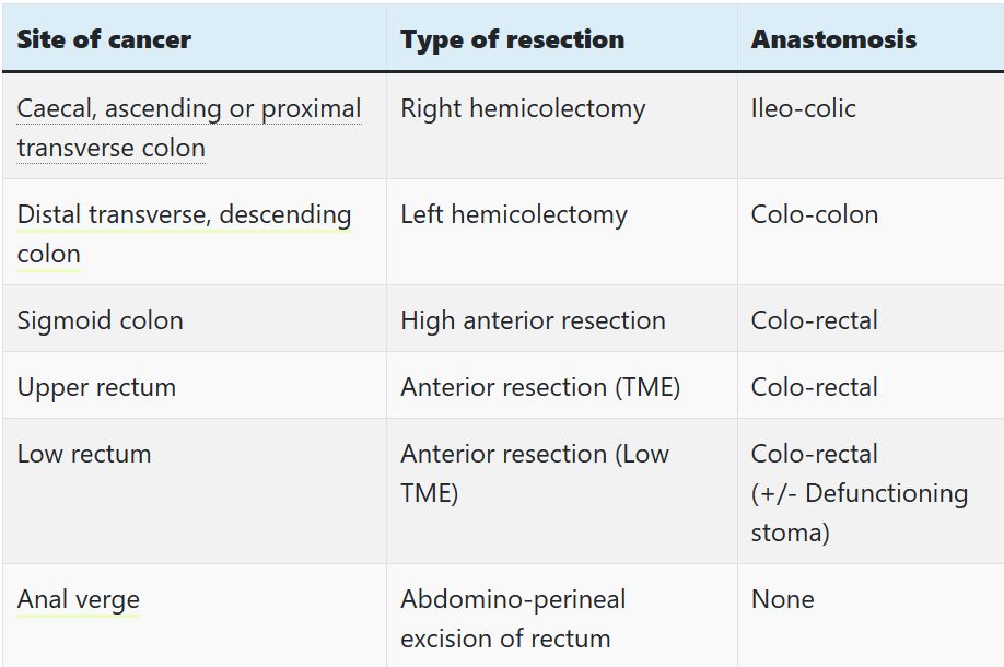 - APR results in complete removal of the rectum and anus resulting in permenant colostomy<br>- Also indicated in cases close to the anal verge where sphincter preservation would result in inadequate oncological margins or sphincter preservation would cause impaired postoperative function<br>With thanks to PassMed for the following table:<br><br><img src="18cbf869db7d7516ba54eaa7190d9bc6.jpg">