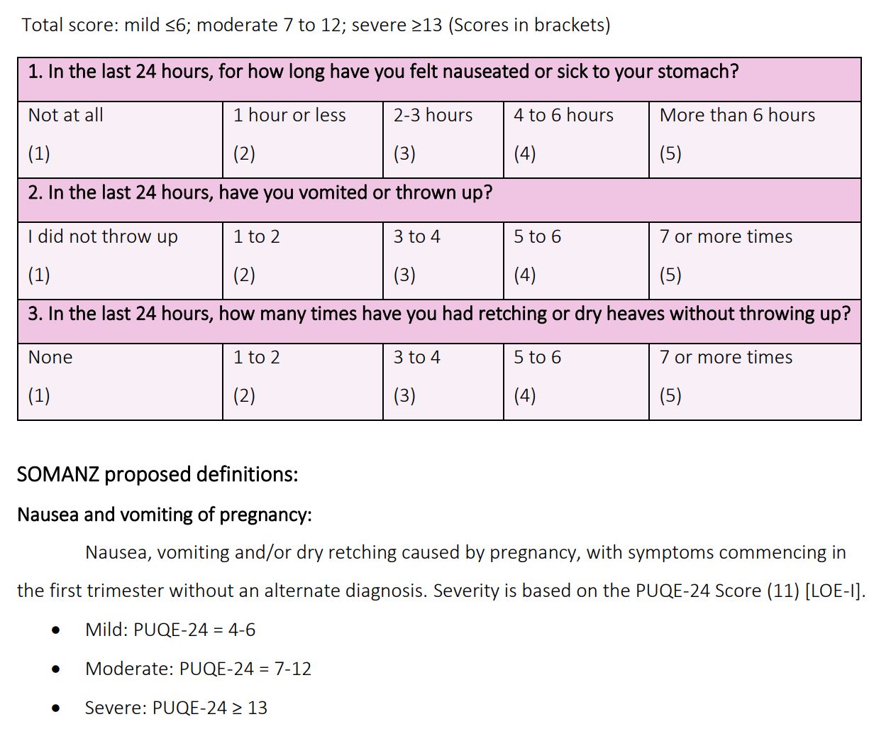 A score of {{c1::≥13}} in the {{c2::PUQE-24}} score is consistent with hyperemesis gravidarum