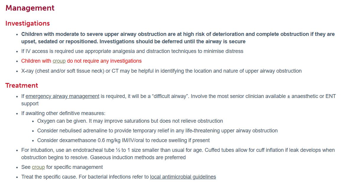 Acute upper airway obstruction. RCH Melbourne Guidelines. Updated March 2021. Accessed September 28, 2023. <a href="https://www.rch.org.au/clinicalguide/guideline_index/acute_upper_airway_obstruction/">Clinical Practice Guidelines : Acute upper airway obstruction (rch.org.au)</a>.<br><br>Therapeutic Guidelines: Acute epiglottitis. Accessed March 2025. <a href="https://app.tg.org.au/viewTopic?etgAccess=true&guidelinePage=Antibiotic&topicfile=acute-epiglottitis&guidelinename=Antibiotic§ionId=toc_d1e47#toc_d1e47">https://app.tg.org.au/viewTopic?etgAccess=true&guidelinePage=Antibiotic&topicfile=acute-epiglottitis&guidelinename=Antibiotic&sectionId=toc_d1e47#toc_d1e47</a>