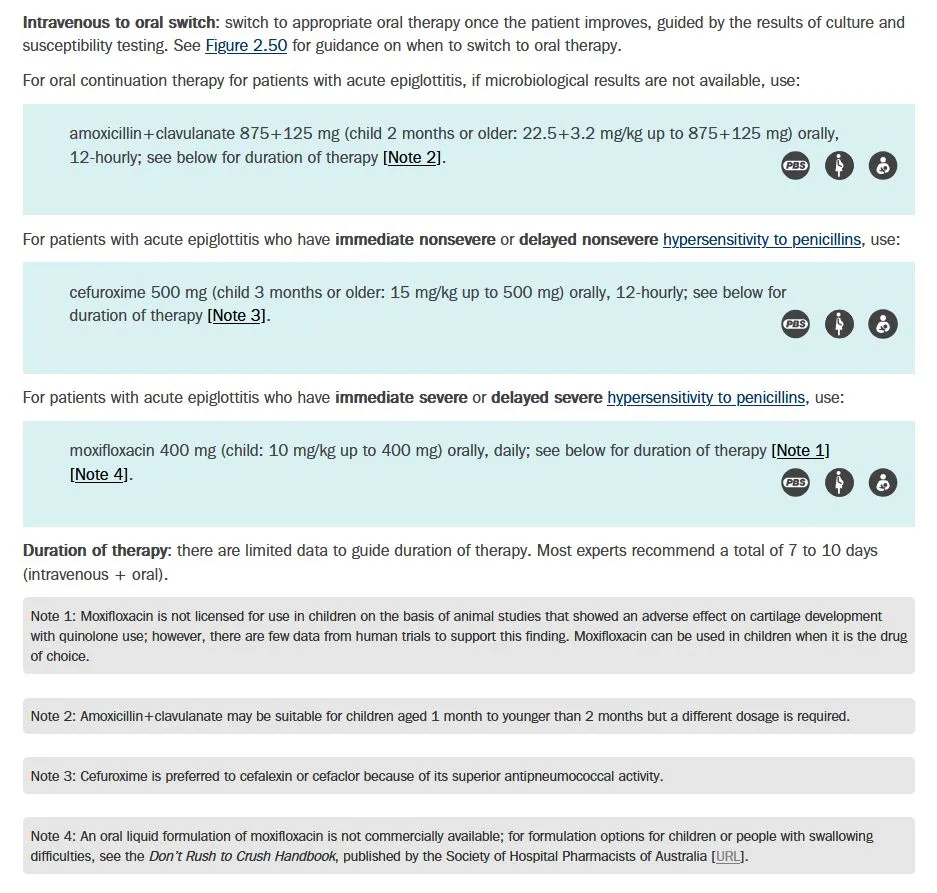 Therapeutic Guidelines: Acute epiglottitis. Accessed March 2025. https://app.tg.org.au/viewTopic?etgAccess=true&guidelinePage=Antibiotic&topicfile=acute-epiglottitis&guidelinename=Antibiotic§ionId=toc_d1e47#toc_d1e47