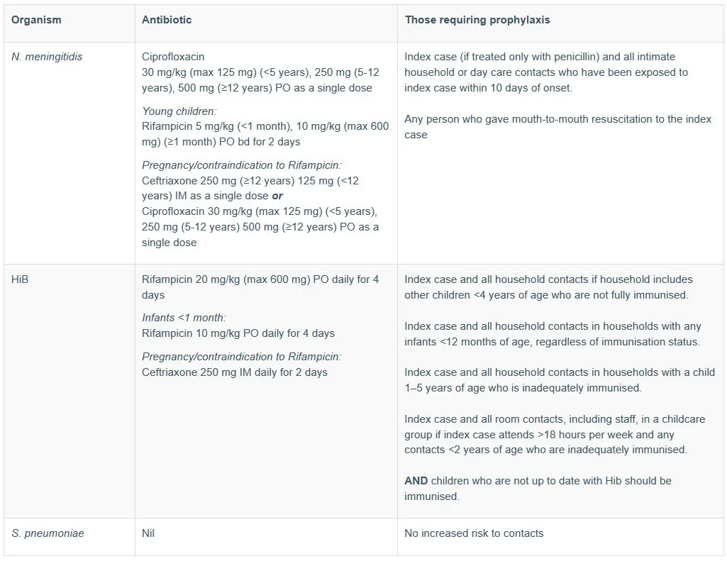Contact prophylaxis for invasive meningococcal or Hib disease. RCH. Accessed April 2025. https://www.rch.org.au/clinicalguide/guideline_index/Meningococcal_prophylaxis/