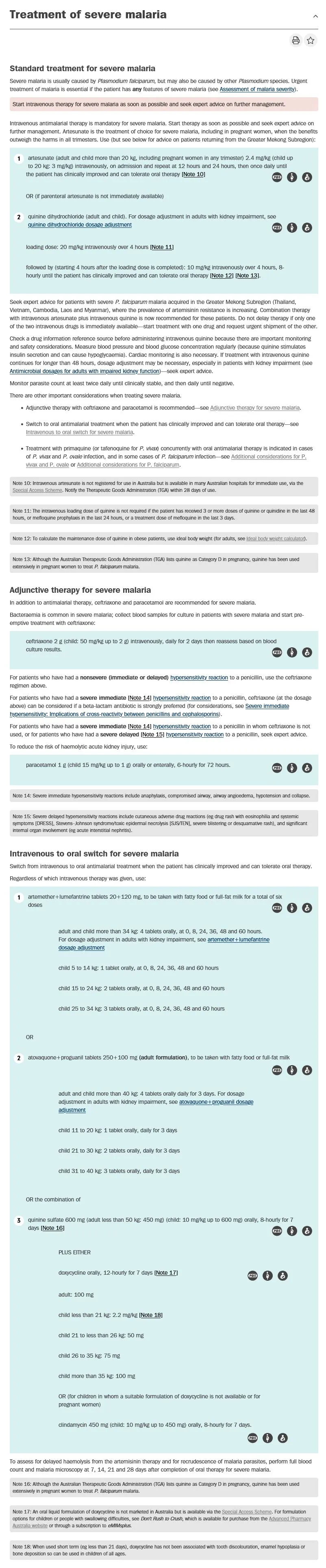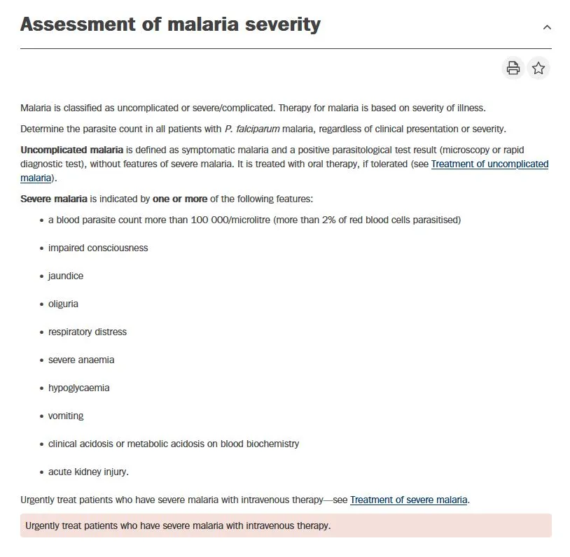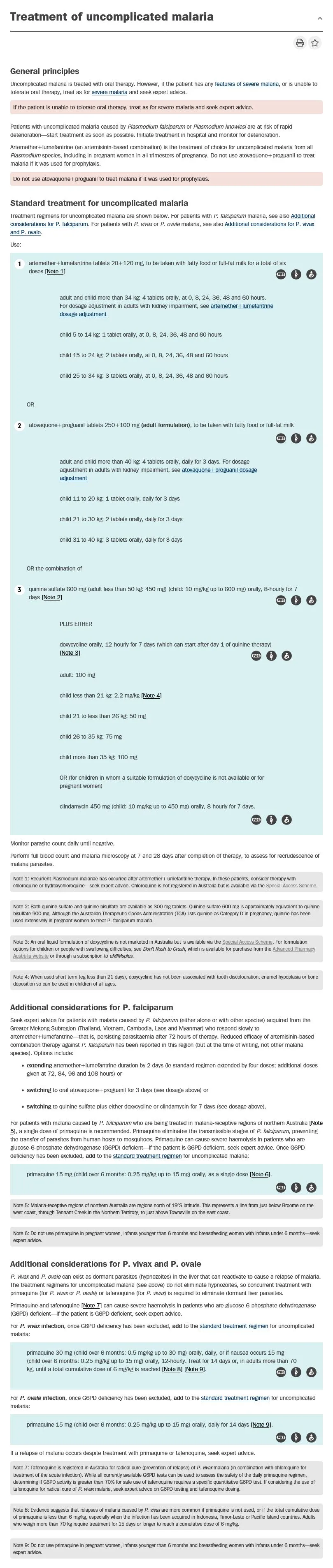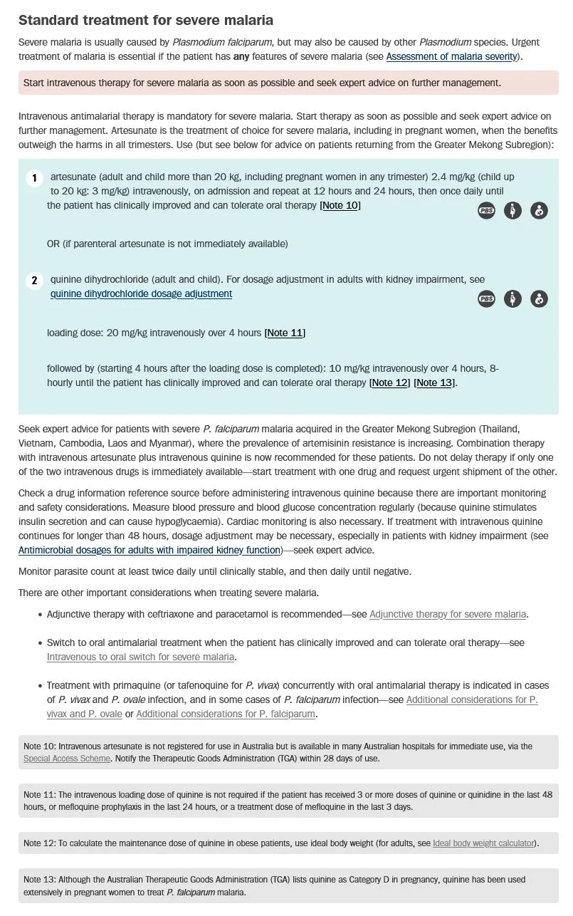 eTG - Malaria <a href="https://app-tg-org.au.eu1.proxy.openathens.net/viewTopic?etgAccess=true&guidelinePage=Antibiotic&topicfile=malaria">https://app-tg-org.au.eu1.proxy.openathens.net/viewTopic?etgAccess=true&guidelinePage=Antibiotic&topicfile=malaria</a> Published/Amended March 2025, Accessed 21 April 2025