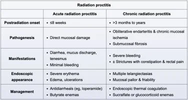 Radiation proctitis, when chronic, is characterized by {{c1::obliterative endarteritis, mucosal ischemia & submucosal fibrosis::3}}