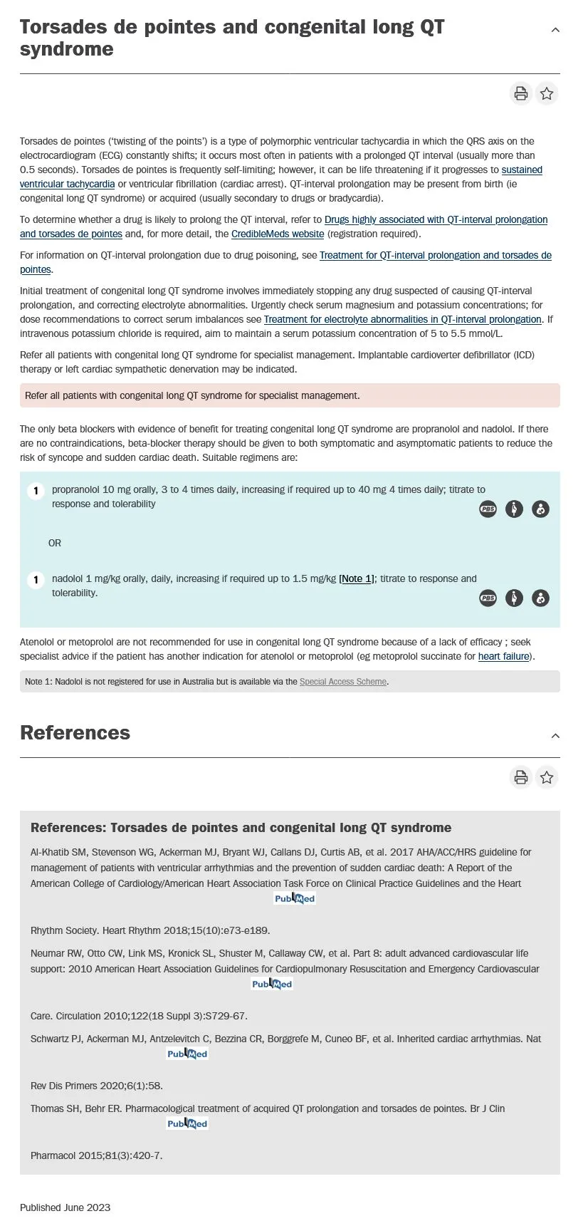 eTG - Torsade de pointes and congenital long QT syndrome <a href="https://app-tg-org.au.eu1.proxy.openathens.net/viewTopic?etgAccess=true&guidelinePage=Cardiovascular&topicfile=c_CVG_Torsades-de-pointes-and-congenital-long-QT-syndrometopic_1&guidelinename=auto§ionId=c_CVG_Torsades-de-pointes-and-congenital-long-QT-syndrometopic_1#c_CVG_Torsades-de-pointes-and-congenital-long-QT-syndrometopic_1">https://app-tg-org.au.eu1.proxy.openathens.net/viewTopic?etgAccess=true&guidelinePage=Cardiovascular&topicfile=c_CVG_Torsades-de-pointes-and-congenital-long-QT-syndrometopic_1&guidelinename=auto&sectionId=c_CVG_Torsades-de-pointes-and-congenital-long-QT-syndrometopic_1#c_CVG_Torsades-de-pointes-and-congenital-long-QT-syndrometopic_1</a> Published/Amended June 2023, Accessed 20 May 2025