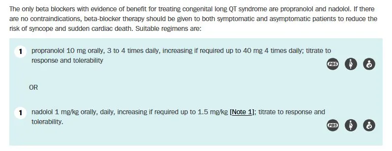 What is the standard management for <b>congenital long QT syndrome</b>, per Therapeutic Guidelines?<br><br>{{c1::Propanolol PO <i><u>OR</u></i> Nadolol PO}}