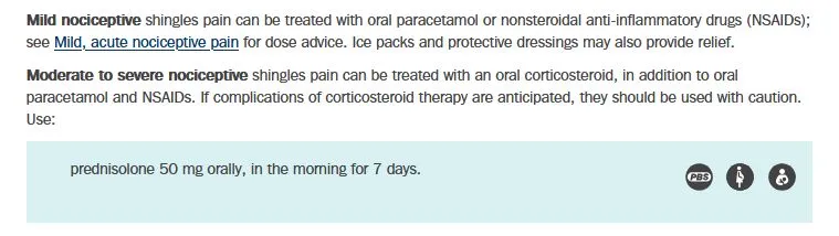 eTG - Acute pain associated with shingles (herpes zoster) <a href="https://app-tg-org-au.ap1.proxy.openathens.net/viewTopic?etgAccess=true&guidelinePage=Pain%20and%20Analgesia&topicfile=pain-shingles&guidelinename=Pain%20and%20Analgesia§ionId=toc_d1e47#toc_d1e47">https://app-tg-org-au.ap1.proxy.openathens.net/viewTopic?etgAccess=true&guidelinePage=Pain and Analgesia&topicfile=pain-shingles&guidelinename=Pain and Analgesia&sectionId=toc_d1e47#toc_d1e47</a> Published/Amended December 2020, Accessed 22 May 2025