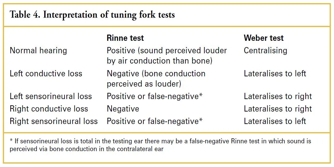 - ie the patient should be able to hear the tuning fork longer conducted via the air, than conducted via the mastoid process<br>- If bone conduction > air conduction, this suggests <u>conductive hearing loss</u> ("negative Rinne's test")<br>- Some practioners place the fork on the mastoid and then hold over the external meatus and say, "which is louder?"<br><br>Weber's Test:<br><img alt="undefined" src="2a3b54d2a0585fbcbf2a8d1c90dc092b.webp" width="300"><br><span style="font-size: 10pt;"><i>By <a class="new" href="http://commons.wikimedia.org/w/index.php?title=User:DrSaltMD&action=edit&redlink=1" title="User:DrSaltMD (page does not exist)">DrSaltMD</a> - <span class="int-own-work" lang="en">Own work</span>, <a href="https://creativecommons.org/licenses/by-sa/4.0" title="Creative Commons Attribution-Share Alike 4.0">CC BY-SA 4.0</a>, <a href="https://commons.wikimedia.org/w/index.php?curid=77951860">Link</a></i><br>Rinne's Test:<span style="font-size: 10pt;"><br></span><img alt="undefined" src="4fa9863b446e6705808f1dc54f2937e6.webp" width="300"><br><i><span style="font-size: 10pt;"><i>By <a href="http://commons.wikimedia.org/wiki/User:FOX_52">FOX 52</a> - Own work, <a href="https://creativecommons.org/licenses/by-sa/4.0">CC BY-SA 4.0</a>, <a href="https://commons.wikimedia.org/w/index.php?curid=72903219">Link</a><br></i></span></i><br><img src="a8f6080670e5c479506494bd0367cb7f.webp" width="539"><br><i><span style="font-size: 10pt;">Australian Journal of General Practice. 2005 Oct 1;34(10):857. <a href="https://www.racgp.org.au/getattachment/78597fc3-e315-4d04-9fc7-38094160d5ba/attachment.aspx">https://www.racgp.org.au/getattachment/78597fc3-e315-4d04-9fc7-38094160d5ba/attachment.aspx</a></span></i></span>