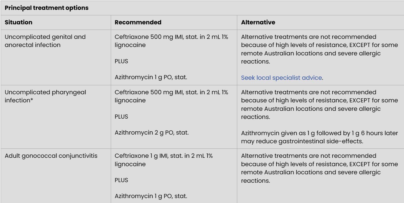 - Alternative treatments are not recommended because of high levels of resistance, EXCEPT for some remote Australian locations and severe allergic reactions (see below)<br>- Both Therapeutic Guidelines and STI Guidelines agree on the drugs<br>- TG suggests Ceftriaxone can be given IV or IM, STI guidelines recommend IM in 2 mL 1% lignocaine<br>- The same drugs are used for anorectal/genital infection, but doses change<br><br><img src="paste-d7866702c14da79ca46cd464cd90afce15b6f652.jpg">