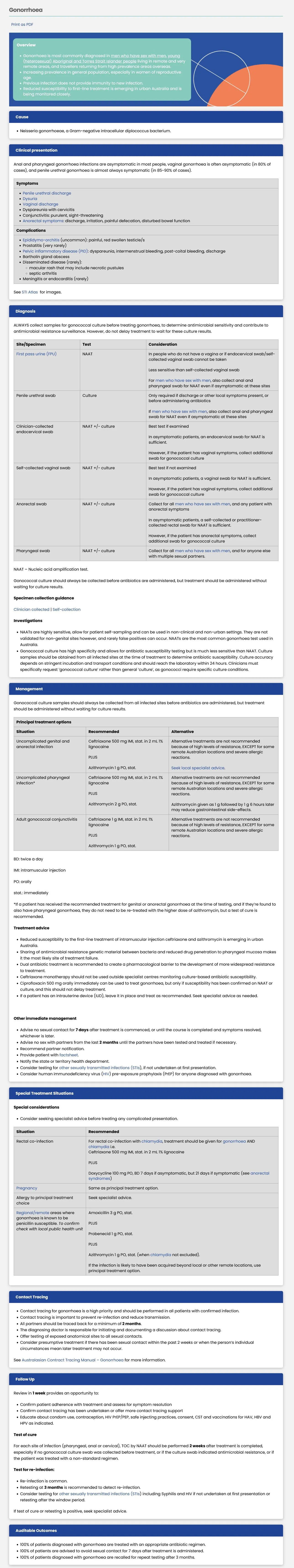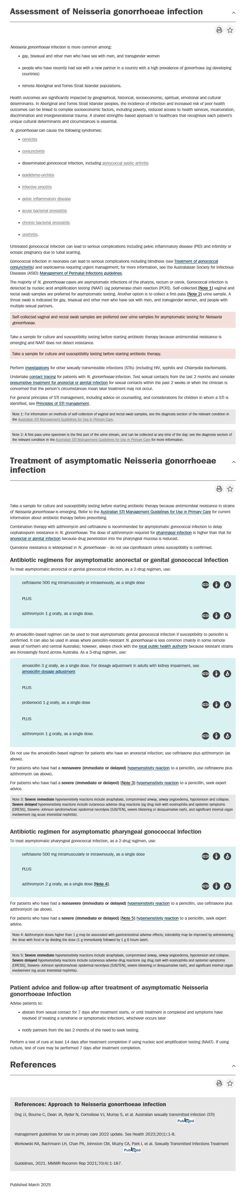 National Guideline: Australasian Sexual and Reproductive Health Alliance (ASRHA) • STI Guidelines Australia • Gonorrhoea. Last updated 2024. Accessed Jun 5 2025. Available at <a href="https://sti.guidelines.org.au/sexually-transmissible-infections/gonorrhoea/">https://sti.guidelines.org.au/sexually-transmissible-infections/gonorrhoea/</a>
