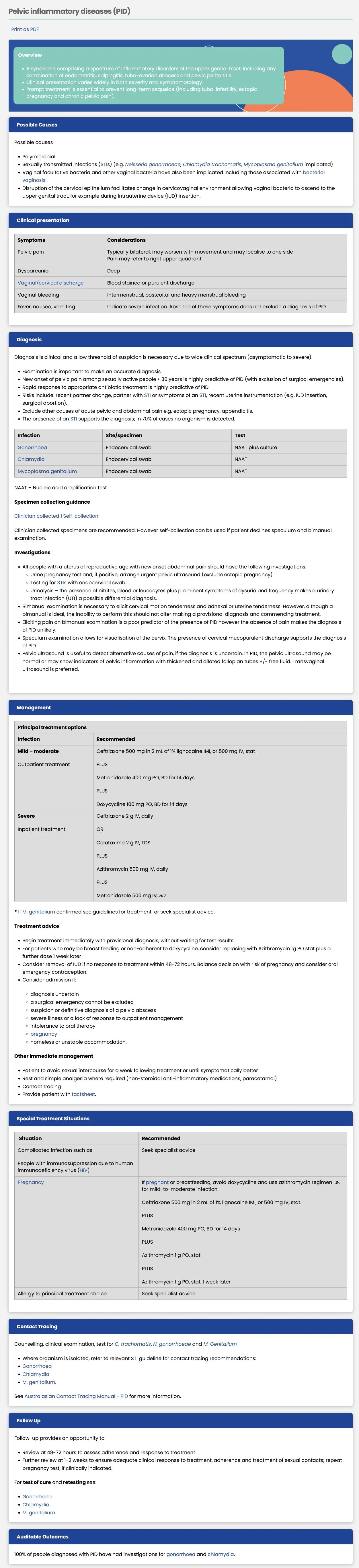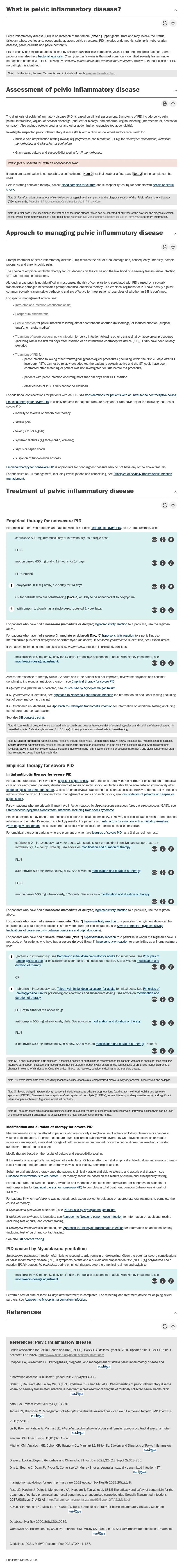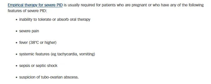 <ul><li>eTG - Pelvic inflammatory disease <a href="https://app-tg-org.au.eu1.proxy.openathens.net/viewTopic?etgAccess=true&guidelinePage=Antibiotic&topicfile=pelvic-inflammatory-disease-postprocedural-pelvic-infection">https://app-tg-org.au.eu1.proxy.openathens.net/viewTopic?etgAccess=true&guidelinePage=Antibiotic&topicfile=pelvic-inflammatory-disease-postprocedural-pelvic-infection</a> Published/Amended March 2025, Accessed 15 June 2025</li><li>National Guideline: ASRHA (Australasian Sexual and Reproductive Health Alliance) • STI Guidelines Australia • Pelvic inflammatory diseases (PID). Last updated 2024. Accessed Jun 15 2025. Available at <a href="https://sti.guidelines.org.au/syndromes/pelvic-inflammatory-diseases-pid/">https://sti.guidelines.org.au/syndromes/pelvic-inflammatory-diseases-pid/</a></li></ul>