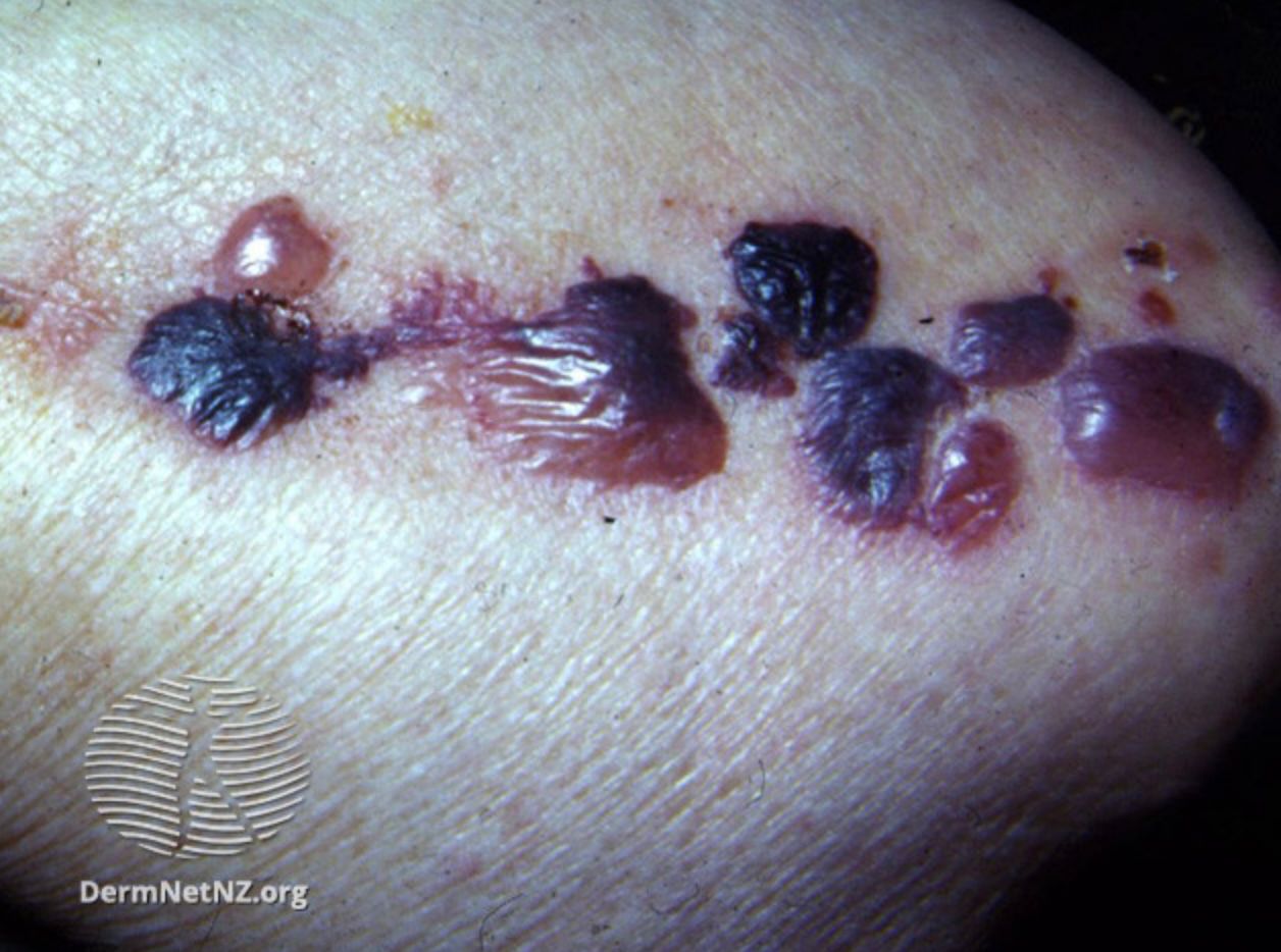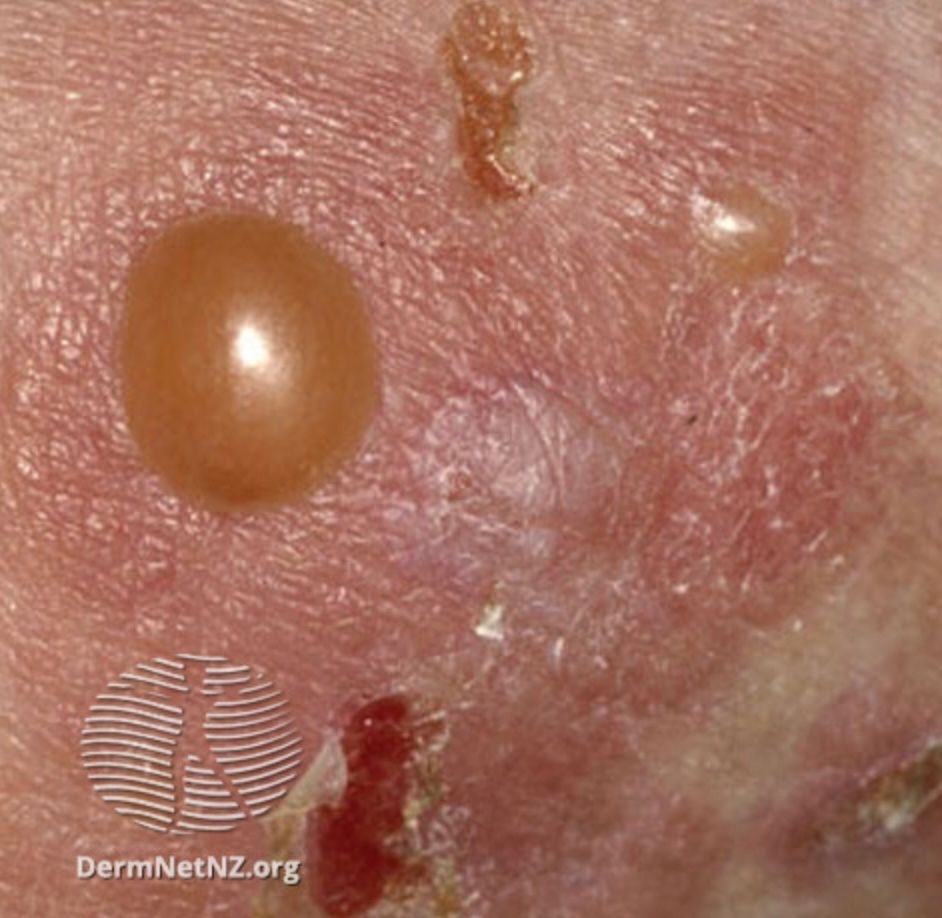 {{c1::Bulla}} is a <u>primary skin lesion</u> that refers to a <b>large</b>, <i>fluid-filled</i> blister <b>> 1 cm</b>