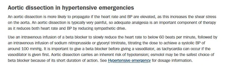 What <u>beta blocker</u> is preferred in the management of <b>aortic dissection</b>, per Therapeutic Guidelines? <br><br>{{c1::Esmolol}}