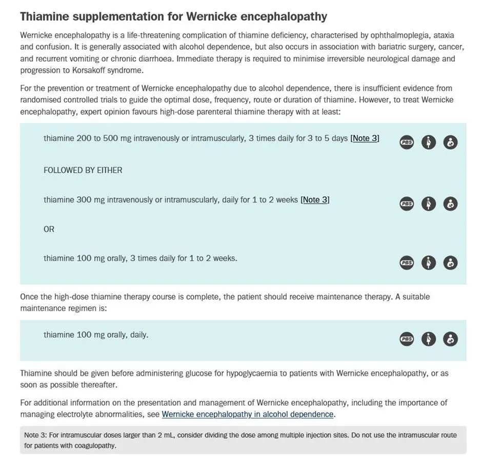 What is the recommended management of patients with <b>Wernicke encephalopathy</b>, per Therapeutic Guidelines?<br><br>{{c1::High-dose thiamine, then daily thiamine supplementation}}