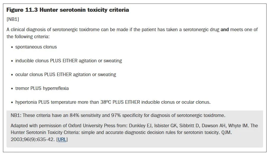 eTG - Serotonergic toxidrome <a href="https://app-tg-org-au.ap1.proxy.openathens.net/viewTopic?etgAccess=true&guidelinePage=Toxicology%20and%20Toxinology&topicfile=toxidrome-serotonergic&guidelinename=Toxicology%20and%20Toxinology&sectionId=toc_d1e47#toc_d1e47">https://app-tg-org-au.ap1.proxy.openathens.net/viewTopic?etgAccess=true&guidelinePage=Toxicology and Toxinology&topicfile=toxidrome-serotonergic&guidelinename=Toxicology and Toxinology&sectionId=toc_d1e47#toc_d1e47</a> Published/Amended August 2020, Accessed 21 August 2025