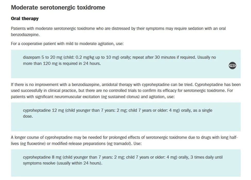 eTG - Serotonergic toxidrome <a href="https://app-tg-org-au.ap1.proxy.openathens.net/viewTopic?etgAccess=true&guidelinePage=Toxicology%20and%20Toxinology&topicfile=toxidrome-serotonergic&guidelinename=Toxicology%20and%20Toxinology&sectionId=toc_d1e47#toc_d1e47">https://app-tg-org-au.ap1.proxy.openathens.net/viewTopic?etgAccess=true&guidelinePage=Toxicology and Toxinology&topicfile=toxidrome-serotonergic&guidelinename=Toxicology and Toxinology&sectionId=toc_d1e47#toc_d1e47</a> Published/Amended August 2020, Accessed 21 August 2025