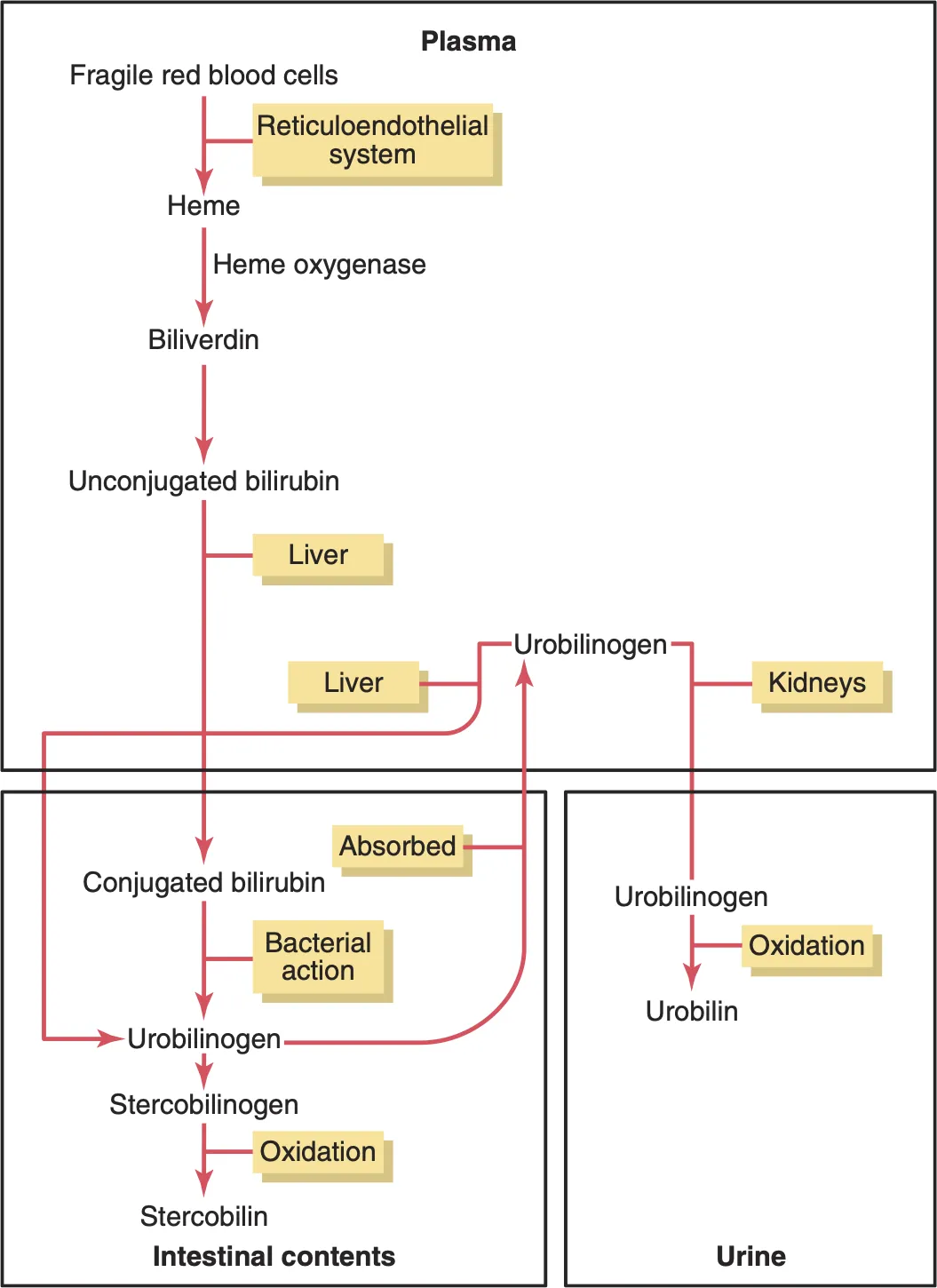 - Following this, the haem ring is split giving free iron and four pyrrole nuclei which eventually become bilirubin