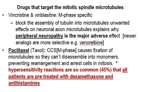 Microtubule inhibitors such as {{c1::vincristine}} and {{c2::paclitaxel}} are {{c3::M-phase}} specific.